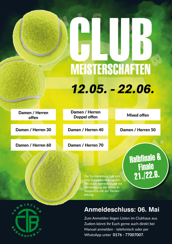Vom 12. Mai bis 22. Juni 2025 finden wieder unsere Clubmeisterschaften beim TC Berghofen statt!